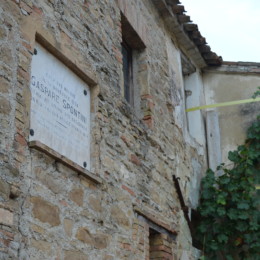 La casa natale di Gaspare Spontini si trova fuori del castello, tra le ultime case del centro abitato, lungo la strada verso Cupramontana.